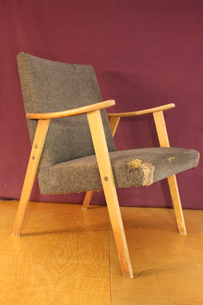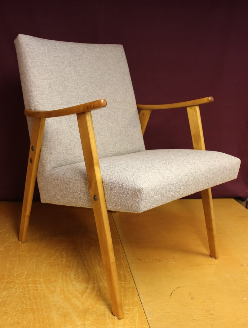 Kaksi nojatuolia oli kokenut kovia aikojen saatossa. Toisesta oli koira jyrsinyt etujalat pahannäköisiksi ja toiseen oli kissa raapinut kankaat puhki. Muutoinki tuolit olivat olleet hylättynä talon vintillä, joten aika oli tehnyt tehtävänsä jousituksille ja pehmusteille. Eli täydellenen remontti ja tällaista jälkeä syntyi. Puuosissa Herdin vesipetsi sävy koivu, lakka Helo puolihimmeänä. Verhoilukangas Orient Occidentin Palermo vaalean harmaana.