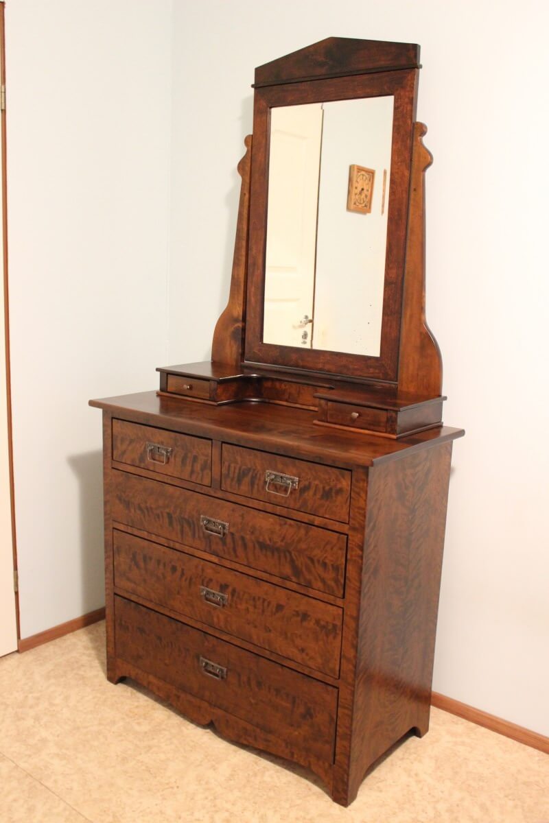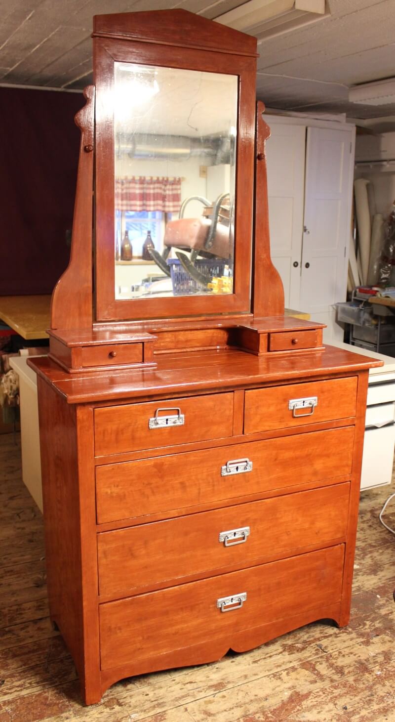 Vanha 1930-luvun peilipiironki oli aikojen kuluessa ehtinyt kokea jo monta eri väriä yllään. Nyt se haluttiin palauttaa tumman ruskeaan väriin takaisin. Kaunis loimukoivupinta pääsi oikeuksiinsa sävytettynä vaalea pähkinä-vesipetsillä. Pintaan puolihimmeä Helo-lakka. Heloitukset puhdistettiin hopeamaalista ja kelpasivat sellaisenaan uudelleen käyttöön.