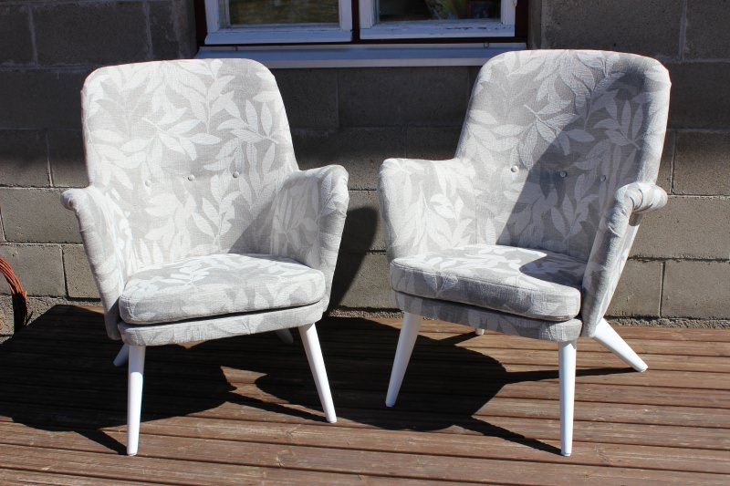 Nojatuolien verhoilu Anu Yleinen 22.5.2013 50-luvun nojatuolienverhoilu Lauritzonin Felicia kankaalla. Myös pehmusteet vaihdettiin ja puuosat maalattiin valkoisiksi.