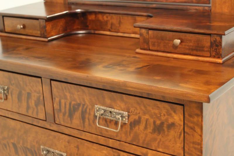 Vanha 1930-luvun peilipiironki oli aikojen kuluessa ehtinyt kokea jo monta eri väriä yllään. Nyt se haluttiin palauttaa tumman ruskeaan väriin takaisin. Kaunis loimukoivupinta pääsi oikeuksiinsa sävytettynä vaalea pähkinä-vesipetsillä. Pintaan puolihimmeä Helo-lakka. Heloitukset puhdistettiin hopeamaalista ja kelpasivat sellaisenaan uudelleen käyttöön.