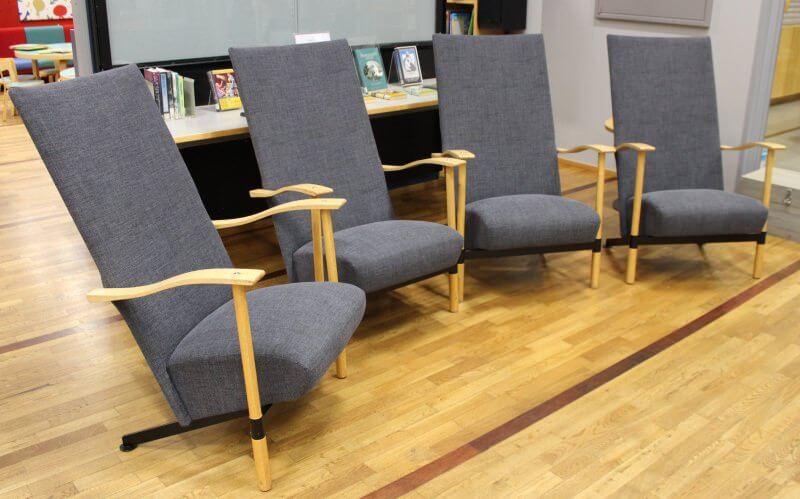 Kirjaston asiakastuolien verhoilu Anu Yleinen 1.2.2015Andante-kangas, Orient occident, verhoilu Kirjaston asiakastuolit olivat jo pahoin kuluneet ja siirretty varastoon odottamaan parempia aikoja. Uudelleen verhoilemalla niistä saatiin vielä kunnon kalusteet. Verhoilukangas Orient Occidentin Andante harmaana.