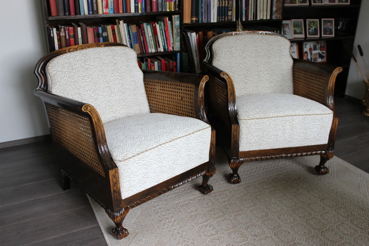 Tällaiset Chippendale-nojatuolit tulivat verhoiltavaksi ensimmäisenä. Karu totuus paljastui vanhojen kankaiden alta ja uusiksi menivät niin jousitukset, kuin toppauksetkin. Verhoilukankaana Lauritzonin Velasco valkoisena. Puuosien puhdistus ja kiillotus restaurointiöljyllä.